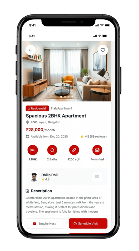 Save favorites, send enquiries, chat with hosts, and schedule visits at your convenience without unnecessary delays.